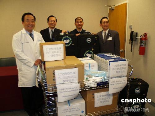 5月23日,由美國人醫(yī)會(huì)、仁愛醫(yī)療集團(tuán)和嘉惠爾醫(yī)院10名華裔醫(yī)師組成的醫(yī)療賑災(zāi)小組飛往四川災(zāi)區(qū)參加救援,包括骨科醫(yī)師林元清、精神科醫(yī)師王炘、腦神經(jīng)科醫(yī)師林宗義、許明彰、外科醫(yī)師陳福民等。救援小組初步計(jì)劃在災(zāi)區(qū)停留10天。圖為林元清等華裔醫(yī)師攜帶50箱藥物器具前往四川災(zāi)區(qū)。 中新社發(fā) 盧威 攝