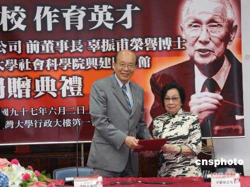 六月二日,辜振甫的遺孀辜嚴(yán)倬云替他完成遺愿,捐贈(zèng)臺(tái)灣大學(xué)社會(huì)科學(xué)院興建圖書館。圖為臺(tái)灣大學(xué)校長(zhǎng)李嗣涔向辜嚴(yán)倬云致贈(zèng)感謝狀。中新社發(fā) 耿軍 攝