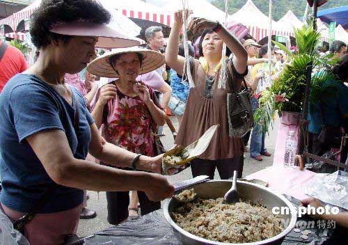 六月七日,為迎接農(nóng)歷端午佳節(jié),臺(tái)灣阿嬤阿媽在臺(tái)北縣坪林街頭參與“街頭包粽DIY”活動(dòng),每人只要花二十元新臺(tái)幣作為成本費(fèi),即可自選材料現(xiàn)場(chǎng)DIY包粽一只,包完后可直接帶回家。一些勤快的家庭主婦樂此不疲。中新社發(fā) 許曉青 攝