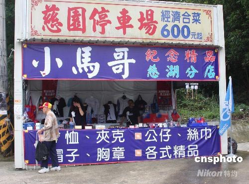 臺(tái)灣旅游業(yè)界為迎接大陸居民赴臺(tái)旅游,已開(kāi)始做各項(xiàng)準(zhǔn)備工作。圖為臺(tái)灣桃園縣經(jīng)營(yíng)旅游商品的商販,在慈湖蔣介石陵寢的路邊,設(shè)立了招攬大陸游客的、專售與馬英九相關(guān)的旅游紀(jì)念品的商棚。中新社發(fā) 耿軍 攝