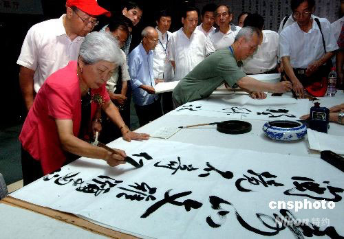 6月19日,參加海峽兩岸壽山石文化書法精品展的兩岸知名書法家,在福州博物館舉行交流筆會(huì)。圖為臺(tái)灣中國(guó)書法家學(xué)會(huì)理事長(zhǎng)謝季蕓女士(左一)、臺(tái)灣中國(guó)書法家學(xué)會(huì)副理事長(zhǎng)陳炫明在海峽兩岸書法家交流筆會(huì)上揮毫。中新社發(fā) 劉可耕 攝