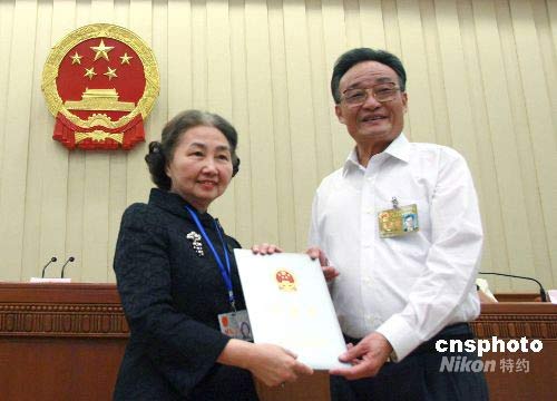 6月26日,全國(guó)人大常委會(huì)委員長(zhǎng)吳邦國(guó)向梁愛(ài)詩(shī)女士頒發(fā)香港基本法委員會(huì)任命證書(shū)。第十一屆全國(guó)人大常委會(huì)第三次會(huì)議當(dāng)天在北京人民大會(huì)堂閉幕,會(huì)議表決通過(guò)了全國(guó)人大常委會(huì)香港特區(qū)基本法委員會(huì)組成人員名單。中新社發(fā) 廖文靜 攝