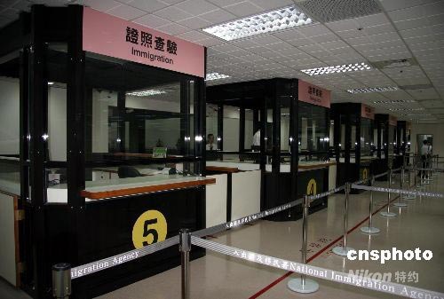 兩岸周末包機(jī)將于七月四日啟程,臺(tái)北松山機(jī)場當(dāng)日到港四班。為因應(yīng)周末包機(jī)需要,松山機(jī)場在二十多天時(shí)間內(nèi),基本完成了機(jī)場整修。圖為裝修一新的證照查驗(yàn)通道。中新社發(fā) 徐長安 攝