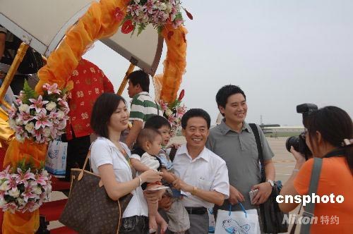 圖:臺胞全家合影留住兩岸周末包機首航瞬間