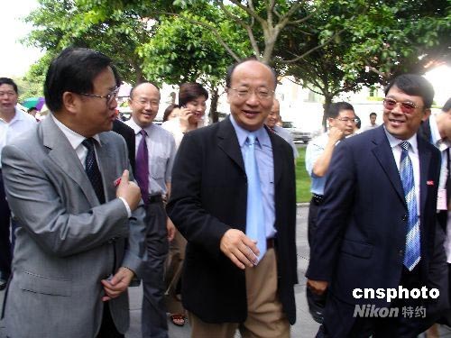 七月五日上午,臺(tái)中市市長(zhǎng)胡志強(qiáng)(中)到廈門大學(xué)參訪。圖為廈門大學(xué)黨委書(shū)記朱之文(右)、廈大校長(zhǎng)朱崇實(shí)(左)陪同他參觀校園。中新社發(fā) 楊伏山 攝