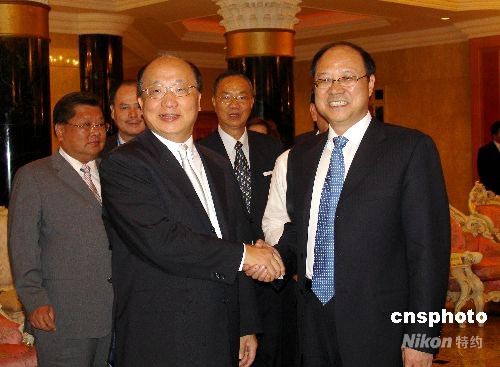 七月七日中午,中共中央臺辦、國臺辦常務副主任鄭立中(前右),在廈門親切會見搭乘周末包機從臺中首航廈門的臺中市市長胡志強(前左)一行。圖為兩人熱烈握手致意。中新社發(fā) 楊伏山 攝