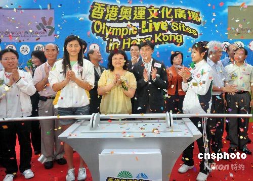 為營造熱烈的奧運(yùn)氣氛,讓香港市民積極投入北京二零零八年奧運(yùn)會,香港康樂及文化事務(wù)署七月八日宣布,將于八月奧運(yùn)會舉行期間在維多利亞公園及沙田公園設(shè)立奧運(yùn)文化廣場。圖為香港民政事務(wù)局常任秘書長尤曾家麗及康文署署長周達(dá)明與香港精英運(yùn)動員、十八區(qū)區(qū)議會和體育總會的代表出席當(dāng)日舉行的開展儀式。 中新社發(fā) 鄧慶樂 攝