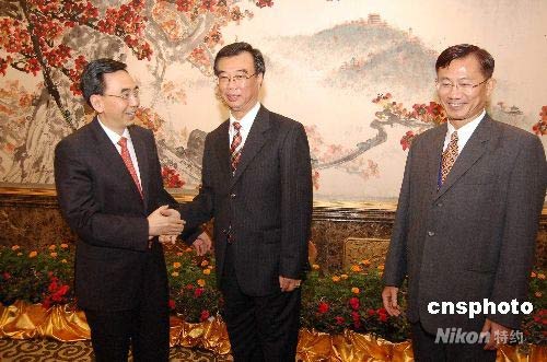 中國(guó)國(guó)民黨高雄市委員會(huì)廣州訪問(wèn)團(tuán)一行,七月十二日搭乘高雄至廣州周末包機(jī)抵穗。中共廣州市委書記朱小丹(左一),在廣州東方賓館會(huì)見該訪問(wèn)團(tuán)全體成員。中新社發(fā) 柯小軍 攝
