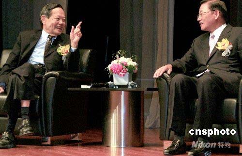 7月17日,第三屆“兩岸論壇”“臺(tái)海新局與兩岸經(jīng)貿(mào)發(fā)展”論壇在香港會(huì)展中心舉行。圖為海峽交流基金會(huì)董事長(zhǎng)江丙坤博士(右)與諾貝爾物理學(xué)獎(jiǎng)獲得者中央研究院院士楊振寧博士(左)出席論壇并愉快交談。中新社發(fā) 張勤 攝