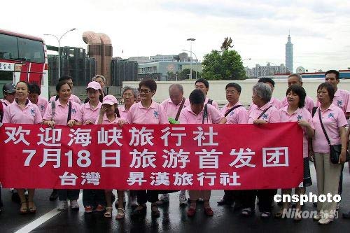大陸居民赴臺旅游十八日正式實施,首批游客從臺北松山機場入境抵臺。這也標志著各界期盼已久的大陸居民赴臺游開始步入常態(tài)化。圖為從松山機場出站的大陸游客在機場合影。中新社發(fā) 徐長安 攝