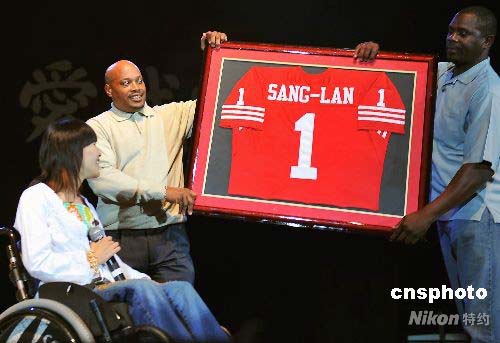 當(dāng)?shù)貢r間七月十九日,特意趕來參加舊金山華人華僑舉辦的《唱響奧運 愛我中華》音樂會的奧運火炬手桑蘭,意外收到舊金山著名的四十九人棒球隊繡有桑蘭名字的一號球衣。中新社發(fā) 陳鋼 攝