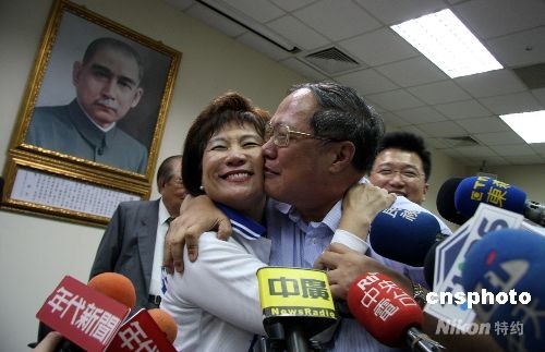 7月26日傍晚,2008年中國國民黨中央常務(wù)委員選舉在臺北揭曉,40名登記參選者中有32人當(dāng)選。圖為國民黨中央黨部,獲選中常委的麗耿桂芳與丈夫厲威廉當(dāng)場擁吻,成為眾媒體焦點。中新社發(fā) 董會峰 攝