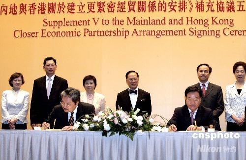 七月二十九日,《內(nèi)地與香港關(guān)于建立更緊密經(jīng)貿(mào)關(guān)系的安排》補(bǔ)充協(xié)議五簽署儀式在香港政府總部新翼一樓會(huì)議廳舉行。在行政長(zhǎng)官曾蔭權(quán)等嘉賓的見證下,財(cái)政司司長(zhǎng)曾俊華與商務(wù)部副部長(zhǎng)姜增偉簽署補(bǔ)充協(xié)議五。中新社發(fā) 張勤 攝