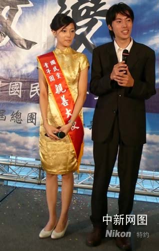 圖為中國(guó)國(guó)民黨青年團(tuán)新任總團(tuán)長(zhǎng)、政治大學(xué)研究生梁靧(右)與中國(guó)國(guó)民黨青年團(tuán)親善大使施佳玫。