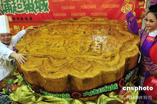 九月三日,香港一商場(chǎng)展示全港最大型的月餅迎接中秋佳節(jié)。月餅王直徑達(dá)七十二吋寬、高十八吋、重量逾一千斤。中新社發(fā) 譚達(dá)明 攝
