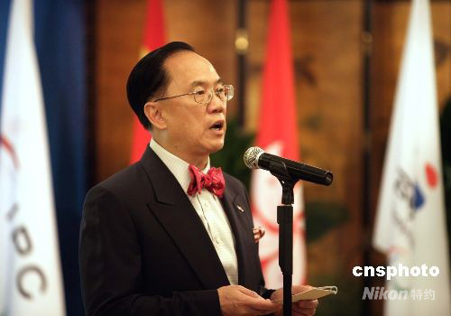 九月十日,香港行政長官曾蔭權(quán)在酒店舉行午宴,歡迎殘奧委員會主席克雷文爵士訪港。午宴前曾蔭權(quán)、克雷文爵士在歡迎午宴上分別致辭。 中新社發(fā) 張勤 攝