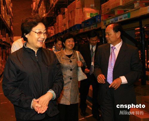 當?shù)貢r間11日下午,抵英訪問的中國國務院僑辦主任李海峰前往當?shù)厝A商企業(yè)“泗和行”,現(xiàn)場了解其經(jīng)營與發(fā)展狀況。圖為李海峰(左)在泗和行老板謝貴全(右)的陪同下,參觀其現(xiàn)代化倉儲基地。中新社發(fā) 李鵬 攝