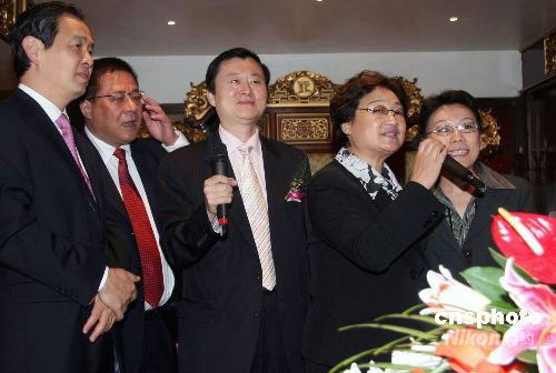 法國僑界十六日晚在巴黎舉行盛大歡迎會,歡迎中國國務(wù)院僑辦主任李海峰率團訪法。在僑胞要求下,李海峰(右二)演唱歌曲《;丶铱纯础罚瑲g迎僑胞;刈鎳⒊;丶亦l(xiāng)走走看看。中新社發(fā) 吳衛(wèi)中 攝