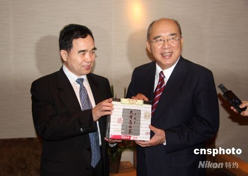 圖為吳伯雄向柳斌杰贈(zèng)送臺(tái)灣的“太峰高山茶”。
