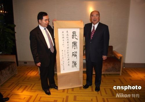 圖為柳斌杰向吳伯雄贈(zèng)送“長(zhǎng)風(fēng)破浪”的書法條幅。