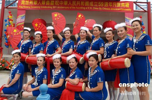 當(dāng)?shù)貢r(shí)間9月21日上午,美國南加州華人華僑慶祝中華人民共和國成立59周年“十一”國慶升旗典禮儀式在洛杉磯巴恩斯公園隆重舉行,活躍在美國主流社區(qū)的“洛杉磯第一腰鼓隊(duì)”在中國國慶升旗典禮上亮相。 中新社發(fā) 盧威 攝