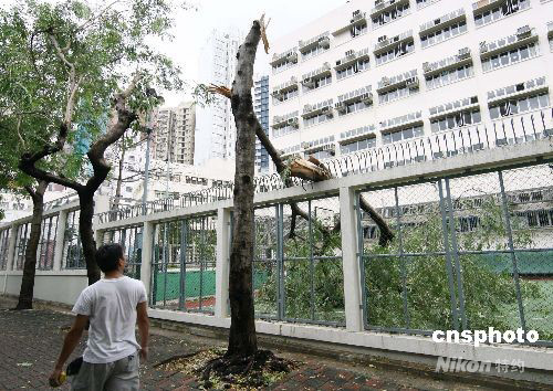 臺風(fēng)“黑格比”襲過香港后,九月二十四日早減弱為三號強風(fēng),香港所有上午校及全日制學(xué)校繼續(xù)停課。圖為灣仔區(qū)一棵大樹被吹折,倒落于一中學(xué)的操場內(nèi)。中新社發(fā) 武仲林 攝