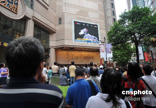九月二十七日,中國(guó)“神舟七號(hào)”航天員翟志剛歷史性作漫步太空,成為中國(guó)航天事業(yè)的新里程碑。在香港銅鑼灣時(shí)代廣場(chǎng)的大型戶外電視屏幕下,眾多市民駐足觀看電視直播。圖為航天員翟志剛漫步太空期間并揮動(dòng)國(guó)旗,以及收集飛船外的太空實(shí)驗(yàn)樣本。中新社發(fā) 鄧慶樂(lè) 攝