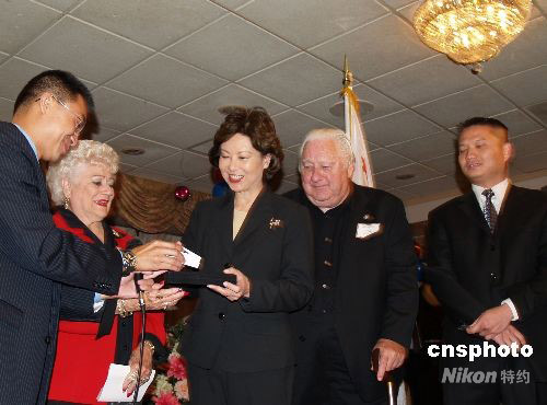 當(dāng)?shù)貢r(shí)間9月29日,美國勞工部長趙小蘭到洛杉磯向亞裔民眾說明美國經(jīng)濟(jì)低迷“解套”辦法,為民眾打氣。加州眾議員陳文、核桃市議員林恩成、鉆石吧市議員張文彬等華人民選官員陪同參加。圖為華人代表向美國勞工部長趙小蘭贈(zèng)送紀(jì)念品。 中新社發(fā) 盧威 攝