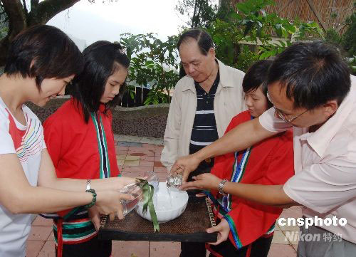 十月二日,參加“2008·陽光海峽”兩岸快樂小天使活動營的兩岸小天使在日月潭畔舉行換水儀式。來自福建閩江的水和臺灣日月潭的水,在兩岸小天使的見證下溶為一體。圖為該活動營領(lǐng)隊(duì)、福建省廣播影視集團(tuán)電視少兒頻道總監(jiān)覃曉清(左)與臺灣南投德化小學(xué)校長梁有章(右)在該換水儀式上共同將兩地的水溶為一體。中新社發(fā) 劉可耕 攝