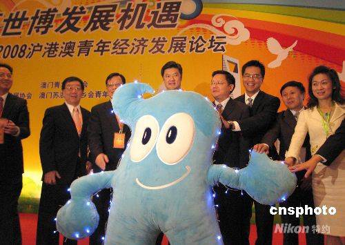 10月7日,“2008滬港澳青年經(jīng)濟發(fā)展論壇”在上海舉行。來自滬港澳三地的青年企業(yè)家、專家學(xué)者、學(xué)生領(lǐng)袖等400余人參加論壇,探討上海世博會的發(fā)展機遇與青年責(zé)任等話題。論壇由上海市青年聯(lián)合會、香港青年聯(lián)會、澳門青年聯(lián)合會等共同主辦,在上海、香港、澳門三地每年一屆、輪替舉行,今年為第十年。圖為滬港澳三地青年代表與上海世博會吉祥物“海寶”牽手,啟動論壇。中新社發(fā) 許曉青 攝