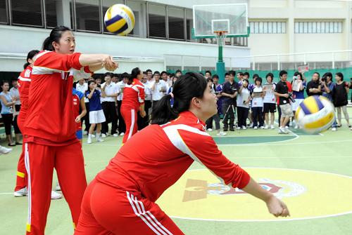 中國女排在香港新法書院與學(xué)生進(jìn)行交流,展示了她們的精湛球技。新華社記者盧炳輝攝
