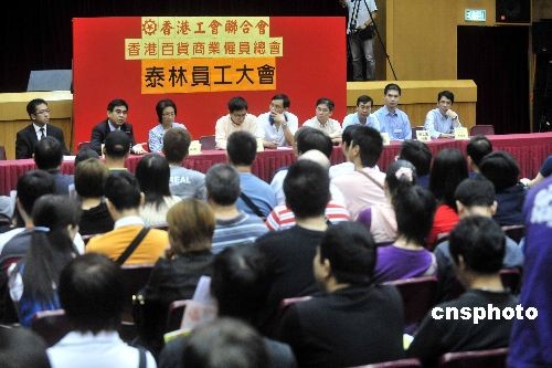 十月二十日,香港工聯(lián)會(huì)早上安排泰林員工與臨時(shí)清盤人開會(huì),大約二百多人出席。香港有六十二年歷史的泰林電器日前全線結(jié)業(yè),受影響的員工被拖欠的薪金及遣散費(fèi),初步估計(jì)多達(dá)一千萬(wàn)港元。中新社發(fā) 譚達(dá)明 攝