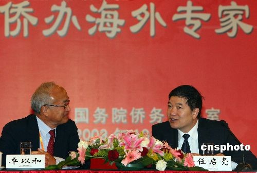 10月27日,第二屆國務(wù)院僑辦海外專家咨詢委員會會議在北京舉行。圖為國務(wù)院僑務(wù)辦公室副主任任啟亮(右)與華裔美籍電機工程學家卓以和(左)在會上交流。中新社發(fā) 廖文靜 攝
