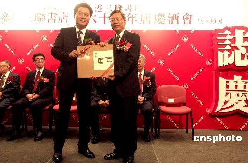 圖為三聯(lián)書店(香港)有限公司總經(jīng)理曾協(xié)泰向中聯(lián)辦副主任李剛贈送紀(jì)念品《明韻》一書。
