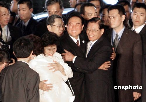 十一月三日,海峽兩岸關(guān)系協(xié)會會長陳云林乘專機(jī)抵達(dá)臺北,出席“第二次陳江會談”。;鶗麻L江丙坤在圓山飯店舉行歡迎儀式。圖為海協(xié)會會長陳云林進(jìn)入臺北圓山飯店與江丙坤熱情擁抱。中新社發(fā) 洪少葵 攝
