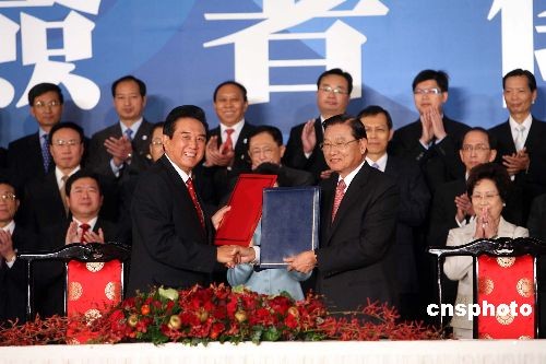 十一月四日,海協(xié)會與;鶗谂_北圓山飯店舉行歷史性的會談后,大陸海協(xié)會會長陳云林與臺灣;鶗麻L江丙坤下午十四時許在臺北就兩岸海運、空運、郵政、食品安全等議題簽署四項協(xié)議。中新社發(fā) 洪少葵 攝