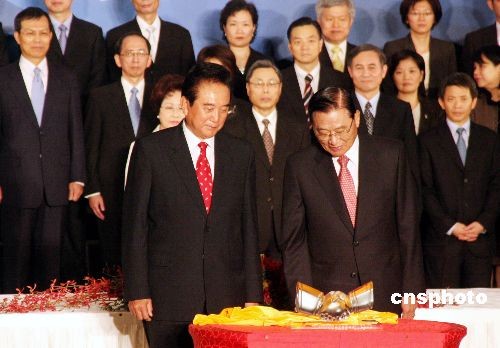 11月4日下午,海協(xié)會會長陳云林和;鶗麻L江丙坤簽署有關兩岸空運直航、海運直航、郵政、食品安全的4項協(xié)議。圖為協(xié)議文本簽署后,陳云林向江丙坤致贈水晶作品《握手》。中新社發(fā) 黃少華 攝