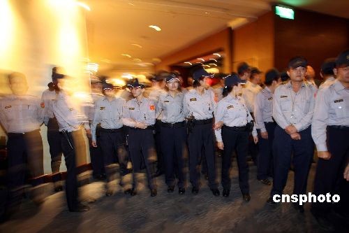 十一月五日晚,國民黨主席吳伯雄在臺北晶華酒店宴請海協(xié)會會長陳云林一行。警方重兵把守酒店外圍,有人士沖擊晚宴會場,在徒勞無功下與警方發(fā)生激烈推撞。中新社發(fā) 洪少葵 攝