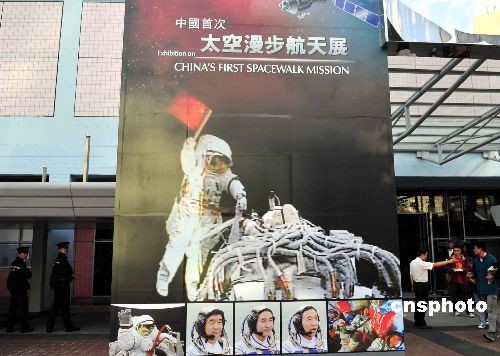“中國(guó)首次太空漫步航天展”將于十二月六至十五日在香港科學(xué)館舉行。展覽將介紹中國(guó)載人航天工程,以及今年順利完成出艙任務(wù)的神舟七號(hào)宇宙飛船及航天員;主要展品則包括神舟七號(hào)宇宙飛船的返回艙、航天服、航天員出艙后所展示的國(guó)旗,以及近百幀珍貴的相關(guān)圖片。圖為巨幅宣傳海報(bào)在科技館門(mén)前展示。中新社發(fā) 譚達(dá)明 攝