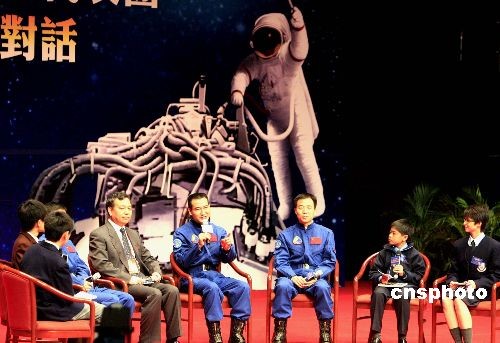 圖為中國載人航天工程辦公室主任及副團(tuán)長王文寶及三位航天員與香港學(xué)生真情對話。