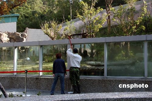 12月18日上午,臺(tái)北市動(dòng)物園進(jìn)行“游客參觀大貓熊動(dòng)線測(cè)試”演練,檢驗(yàn)動(dòng)物園方面目前所規(guī)劃的館內(nèi)教育展示解說(shuō)、游客流量、流速及動(dòng)線順暢度。圖為工人在為“團(tuán)團(tuán)”、“圓圓”新家做護(hù)墻保潔。中新社發(fā) 劉舒凌 攝