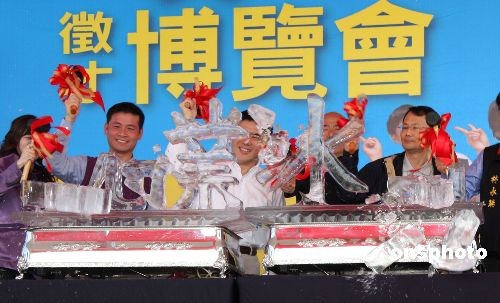 12月20日,在2008臺灣百大服務業(yè)征才博覽會上,臺北市長郝龍斌率眾嘉賓錘擊“就業(yè)冰河”四字。鼓勵大家齊心抗擊“失業(yè)潮”。中新社發(fā) 陳立宇 攝