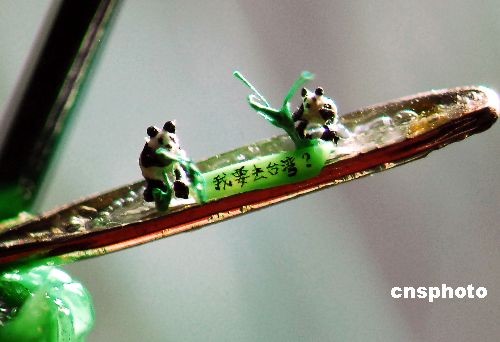 為了迎接12月23日大熊貓“團(tuán)團(tuán)”、“圓圓”的到來,臺(tái)灣著名微雕家陳逢顯特地花了半個(gè)多月的時(shí)間,以樹脂凝膠為材質(zhì),雕刻了一雄、一雌兩只坐在繡花針孔中的立體大熊貓,拉著寫有“我要去臺(tái)灣”的條幅。以表達(dá)他對(duì)團(tuán)團(tuán)、圓圓到來喜悅的心情。中新社發(fā) 陳立宇 攝