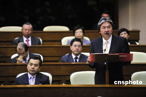 二月二十五日,香港特區(qū)財政司司長曾俊華在立法會大樓會議廳向立法會提交二零零九至二零一零年度財政預算案。中新社發(fā) 譚達明 攝