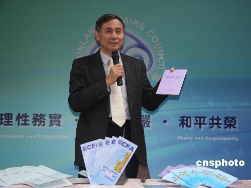 四月七日下午,臺(tái)灣“陸委會(huì)”召開(kāi)臨時(shí)記者會(huì),推介《兩岸會(huì)談相關(guān)政策說(shuō)明》、《ECFA兩岸經(jīng)濟(jì)合作架構(gòu)協(xié)議政策說(shuō)明》兩種新印發(fā)的宣傳手冊(cè),為即將舉行的第三次“陳江會(huì)談”創(chuàng)造積極的輿論氛圍!瓣懳瘯(huì)”副主委劉德勛主持記者會(huì),對(duì)兩本宣傳手冊(cè)做介紹說(shuō)明。中新社發(fā) 耿軍 攝
