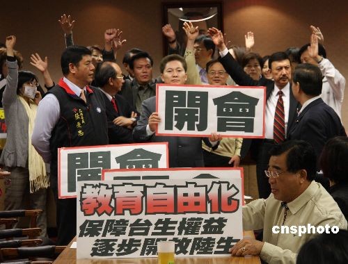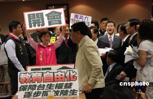 5月4日上午,臺灣“立法院”內政委員會原定審查事關大陸學歷認證、開放大陸學生來臺的兩岸人民關系條例部分條文修正草案。民進黨團總動員,杯葛內政委員會議事進行,并占據(jù)主席臺。民進黨團提散會動議,以八比七的票數(shù)未能通過。民進黨“立委”繼續(xù)占據(jù)主席臺,會議無法進行。圖為民進黨“立委”占據(jù)主席臺后,國民黨“立委”舉起要求正常開會的標語牌。中新社發(fā) 耿軍 攝