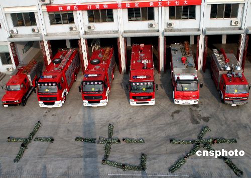 10月17日,江蘇連云港消防支隊(duì)特勤中隊(duì)21名即將退伍的老兵,在操場上交接班時,組成了“十七大”的字樣,以此特殊形式向十七大獻(xiàn)禮。中新社發(fā) 王振<江蘇> 攝