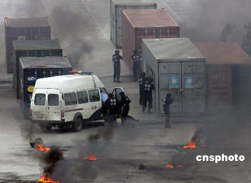 圖為情景設(shè)置:國際恐怖組織策劃武裝劫持開往A國的集裝箱,海港公安阻截并捉拿藏匿在集裝箱內(nèi)的恐怖分子。中新社發(fā) 潘索菲 攝