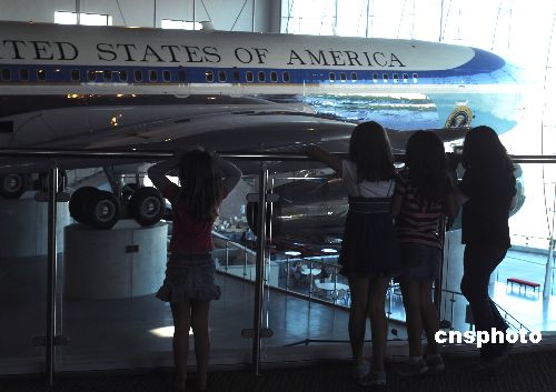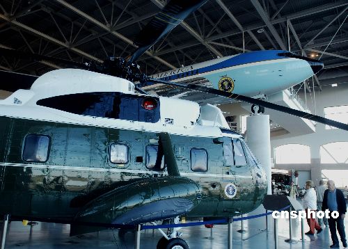 美國(guó)民眾十一月十九日參觀(guān)洛杉磯的里根總統(tǒng)博物館,大廳里展示當(dāng)年三任總統(tǒng)乘坐過(guò)的空軍一號(hào)專(zhuān)機(jī)和海軍一號(hào)直升機(jī)。中新社發(fā) 賈國(guó)榮 攝