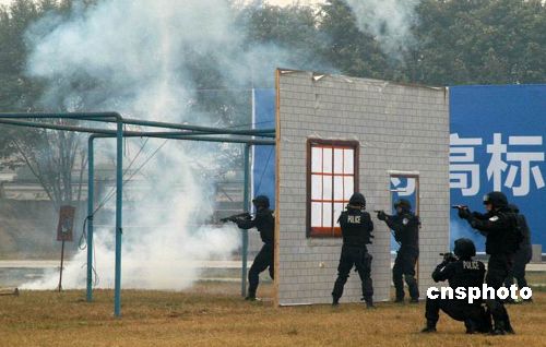 十二月二十八日,廣東佛山公安特警、武警舉行技戰(zhàn)演練,在反劫持人質(zhì)綜合演練中,佛山特警為了解救被“劫持”的5名國(guó)家重點(diǎn)項(xiàng)目科技人員,在反恐指揮部的指令下,地面攻擊組、車(chē)輛突擊組、垂降組、情報(bào)組、爆破組、談判組迅速到達(dá)指定位置待命,然后以迅雷不及掩耳之勢(shì)發(fā)起立體攻擊,瞬間將恐怖分子擊斃,安全解救人質(zhì)。中新社發(fā) 孫建駒 攝